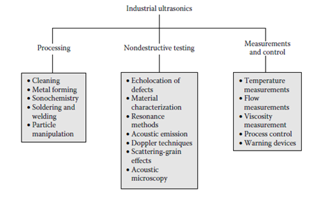 دسته بندی کاربردهای التراسونیک در شمای بالا کاربردهای صنعتی التراسونیک به سه بخش کلی فرآوری، تست غیر مخرب و اندازهگیری و کنترل تقسیم بندی شده است. از جمله کاربردهای فرآوری التراسونیک صنعتی می توان به موارد زیر اشاره کرد: