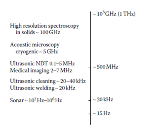 کاربردهای التراسونیک در بازه های فرکانسی متفاوت اگر به نمودار توجه نمایید، خواهید دید که از امواج التراسونیک در فرکانس حدود 20 کیلوهرتز به منظور جوش التراسونیک استفاده می گردد. بازهی فرکانسی 20 تا 40 کیلوهرتز برای شستشوی التراسونیک مورد توجه قرار گرفته. در فرکانس های بالاتر و در حدود 2 تا 5 مگاهرتز در اهداف تشخیصی همچون تصویربرداری پزشکی(سونوگرافی) وNDT(تست غیرمخرب) استفاده می شود. همچنین در فرکانسهای 5 گیگاهرتز تا 1 تراهرتز برای پی بردن به ساختار کریستالی و مولکولی پرکاربرد هستند.